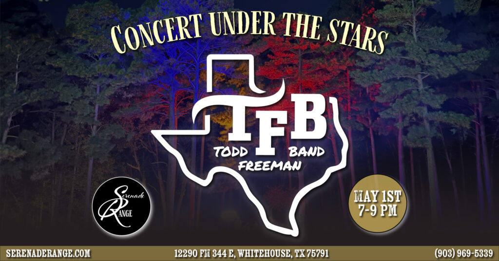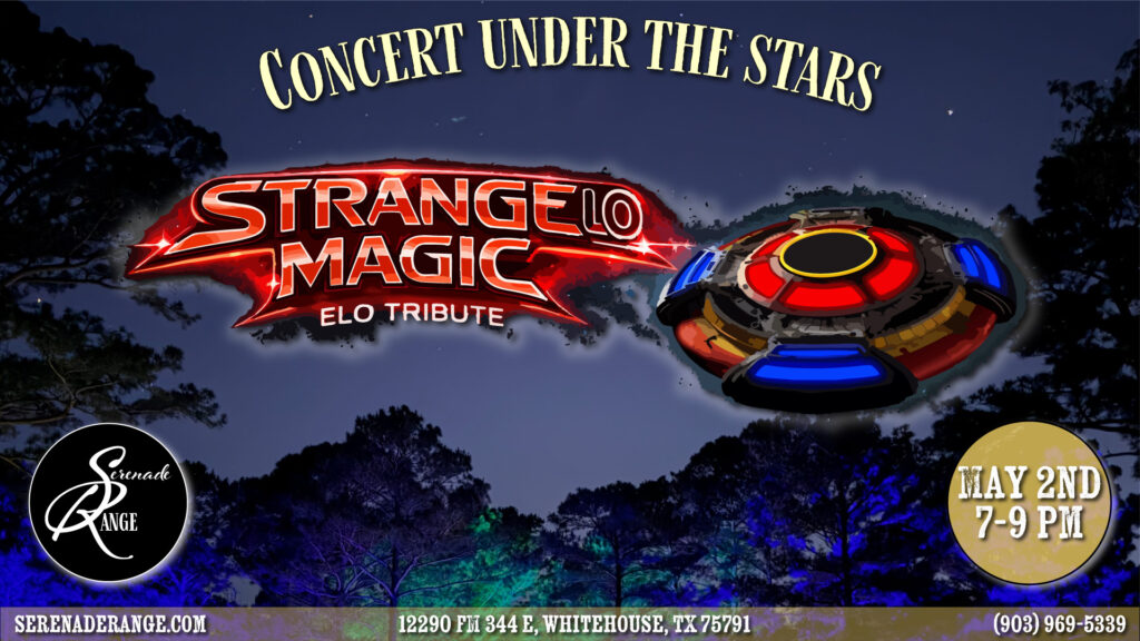 Public Calendar Month View Auto Month List Go ← 2026-04 May 2026 2026-06 → SunMonTueWedThuFriSat1🎵Todd Freeman Band🎵Todd Freeman BandMay 1, 20267:00pm - 9:00pmIf you love real country music, this is gonna be a fun one. Todd Freeman Band brings that true honky-tonk, dance-floor country sound with...Get Tickets2🎵Strange Magic: ELO Tribute🎵Strange Magic: ELO TributeMay 2, 20267:00pm - 9:00pmStrange Magic: An ELO Tribute is coming back to Serenade Range on Saturday, May 2nd from 7–9 PM—and if you were here last year,...Get Tickets345678🎵Eve’s Road🎵Eve’s RoadMay 8, 20267:00pm - 9:00pmEve’s Road is one of those acts that immediately feels different in the best way. Coming out of Tyler, they bring a sound that’s...Get Tickets9🎵Buffet Beach: Jimmy Buffet tribute🎵Buffet Beach: Jimmy Buffet tributeMay 9, 20267:00pm - 9:00pmParrot Heads, this one’s for you. On Saturday, May 9th, Buffet Beach brings the Jimmy Buffett party to Serenade Range from 7–9pm, and this...Get Tickets101112131415🎵The Tuxedo Cats4Ds Brisket Barn🎵The Tuxedo Cats4Ds Brisket BarnMay 15, 20267:00pm - 9:00pmThe Tuxedo Cats are back at Serenade Range on May 15, and we’re excited to welcome them out for their third visit to the...Get Tickets1617181920212223🎵American Petty: A Tom Petty Experience🎵American Petty: A Tom Petty ExperienceMay 23, 20267:00pm - 9:00pmTom Petty fans, this is one you do not want to miss. American Petty: A Tom Petty Experience is coming to Serenade Range on...Get Tickets24252627282930🎵Traveller: Chris Stapleton tribute🎵Traveller: Chris Stapleton tributeMay 30, 20267:00pm - 9:00pmChris Stapleton fans, this one’s for you. Traveller is headed back to Serenade Range on Friday, May 30th from 7-9pm, and if you were...Get Tickets31